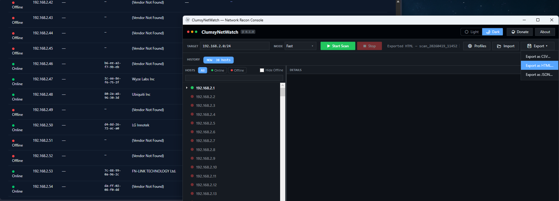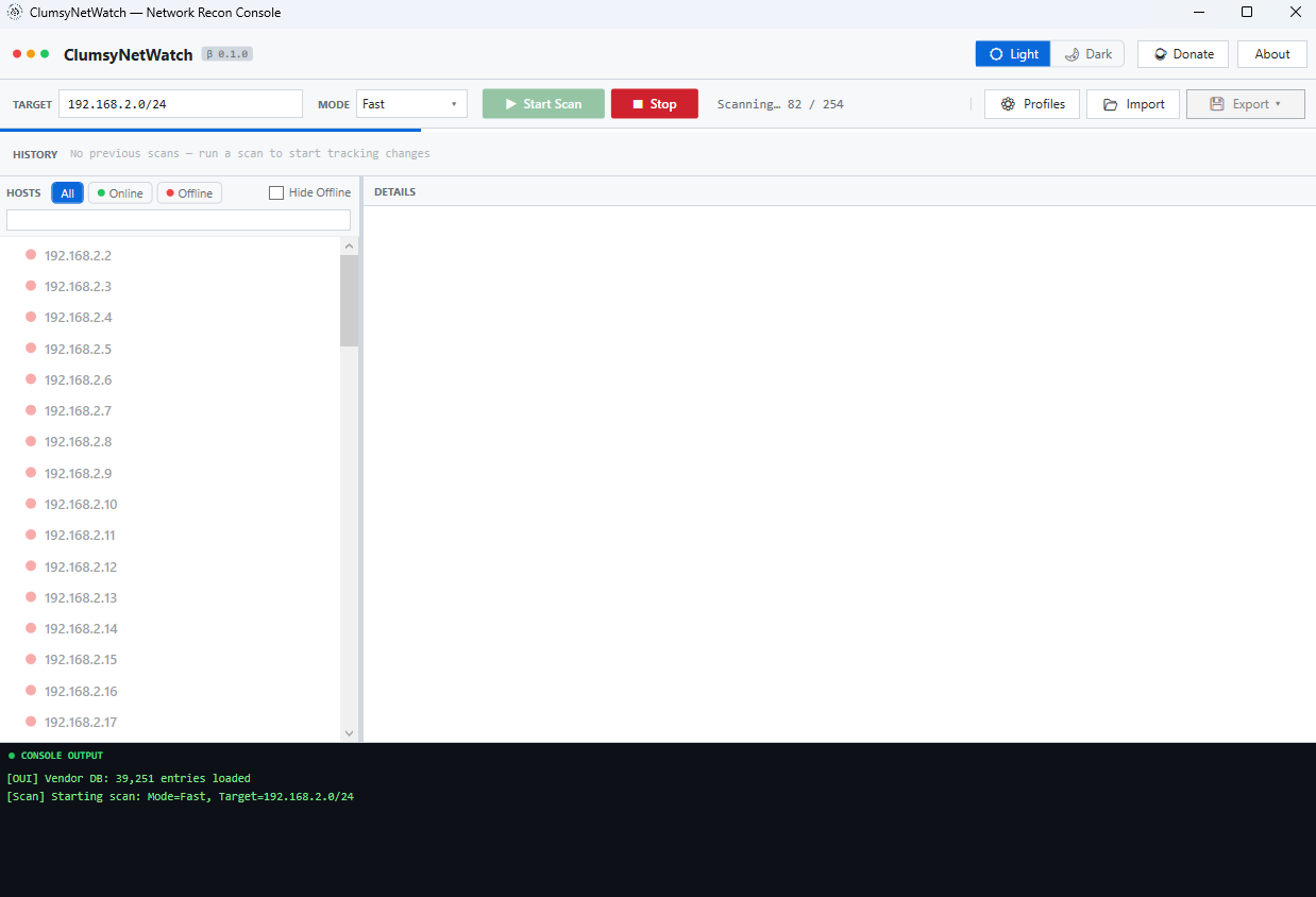 Only use ClumsyNetWatch on networks you own or have explicit authorization to assess. This is a reconnaissance tool, not an exploitation framework. Unauthorized network scanning is illegal and a violation of the Terms of Use.